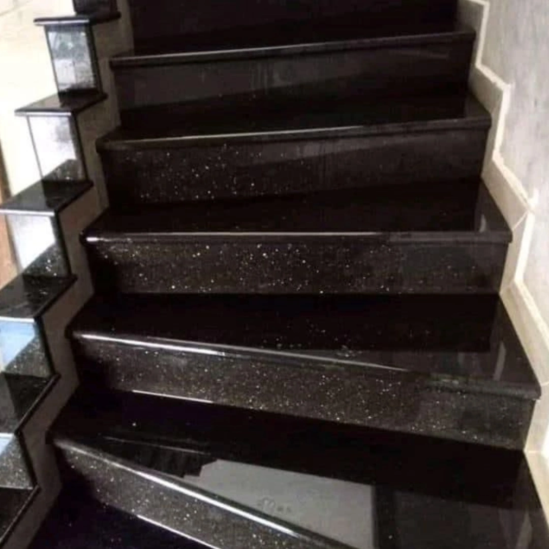 features a deep black background with shimmering gold and silver specks, creating a striking and luxurious look.